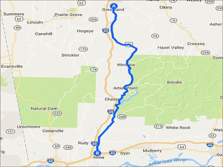 Step by Step Directions:From GreenlandHead south on US-71 S/N Main Ave/S School Ave toward WSmith St Continue to follow US-71 S Destination will be on theright 43.2 mi