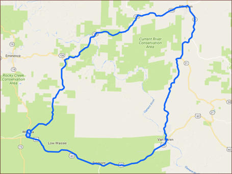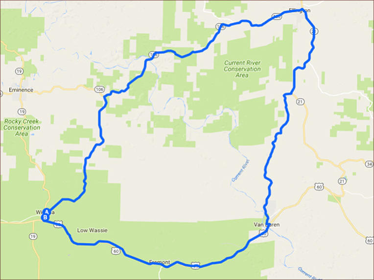 MO-106 E 19.3 mi Turn right onto MO-21 S 7.94 mi Turn right