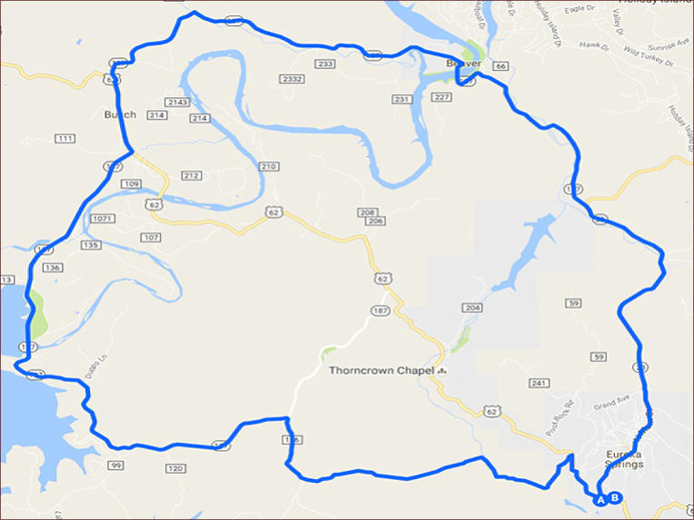 AR-187 6.88 mi * Turn left onto US-62 W 0.934 mi * Turn right onto State Hwy 187 7.30 mi * Slight