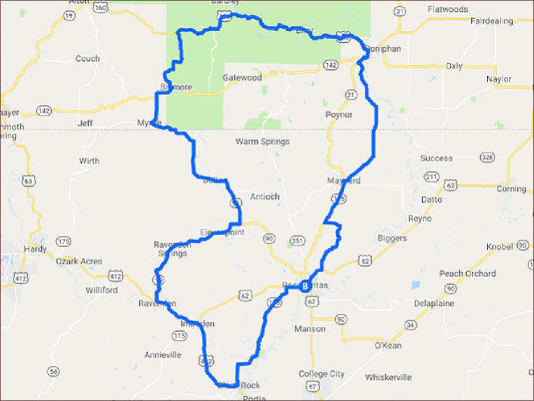 Ozark hills and curves, nature and history! The route takes about