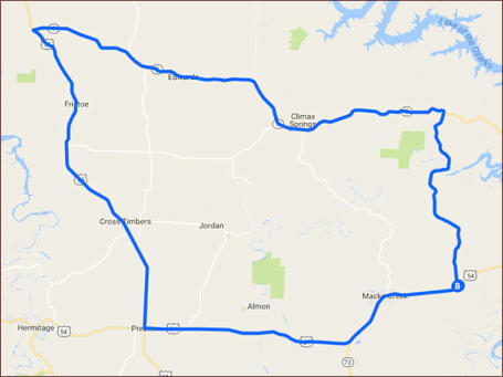 Step by Step Directions:From Hwy J & Hwy 54Head northwest on State Hwy J toward Eidson Rd 11.6 mi * Turn left onto MO-7 N 25.1 mi * Turn leftonto US-65 S 18.8 mi * Turn left onto US-54 E 18.5 mi