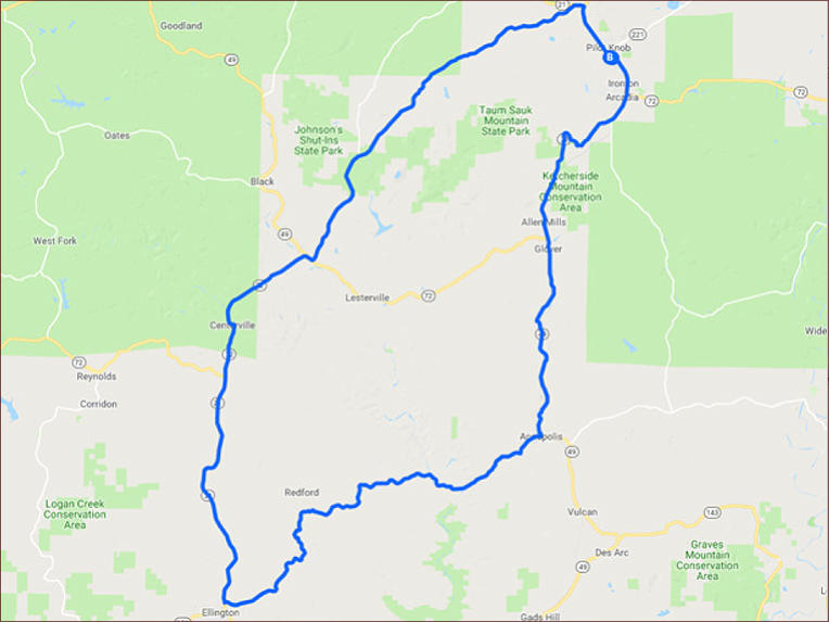 This 85 mile ride loops Taum Sauk Mountain (highest point in