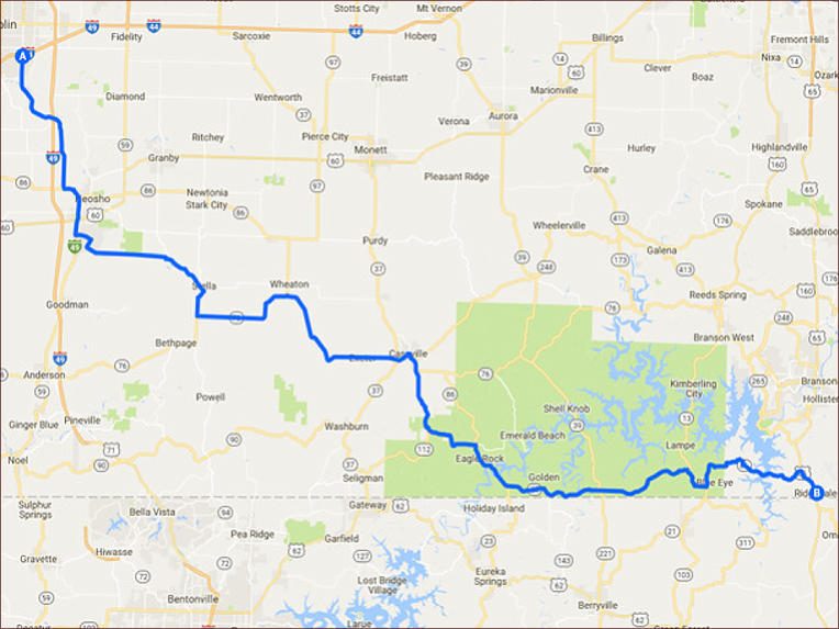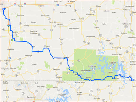 * Turn right onto MO-86 E 22.6 mi * Turn right onto MO-13