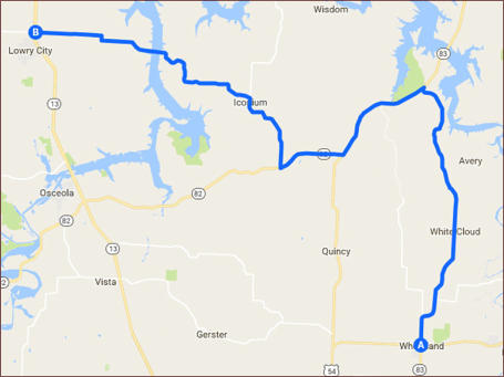 Step by Step Directions:From WheatlandHead north on State Hwy B toward Main St N 7.84 mi * Turn leftonto State Hwy K 5.42 mi * Turn left onto MO-83 S 5.20 mi *Turn right onto MO-82 W 3.08 mi * Turn right onto State HwyU 3.89 mi * Continue onto NE State Hwy C 1,004 ft * Turn left tostay on NE State Hwy C 11.6 mi