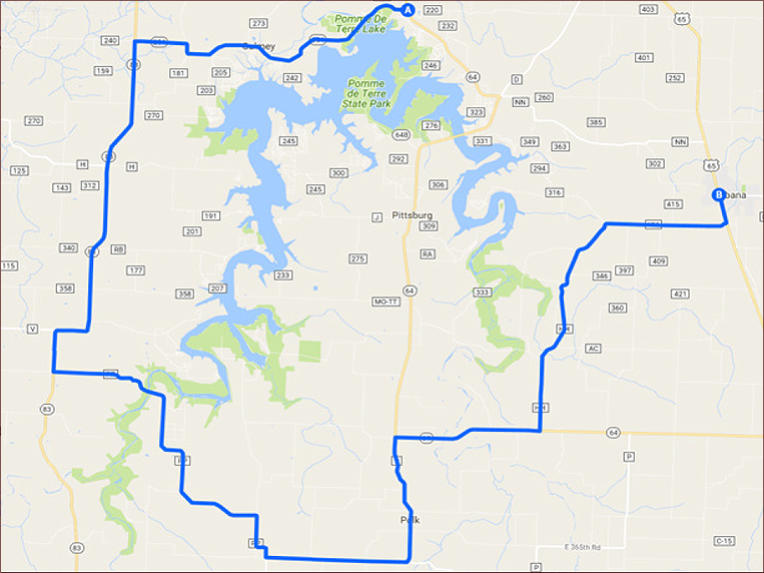 Head west on MO-254 W toward Co Rd 295 7.19 mi Turn left onto MO-83 S 8.93 mi