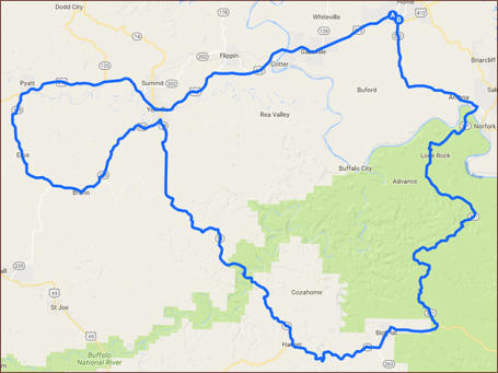 Step by Step Directions:From Mountain HomeHead east on US-62 SW E 509 ft * Continue onto US-62 BUS E 889 ft * Make a U-turn 837 ft * Turn leftonto US-62 SW E 0.467 mi * Turn right onto AR-201 S 9.99 mi * Turn right onto AR-341 S 25.2 mi *Turn right onto AR-14 W 3.77 mi * Turn left onto AR-14 W/2nd Continue to follow AR-14 W 1.21 mi *Turn right to stay on AR-14 W 8.01 mi * Turn right to stay on AR-14 W 22.9 mi * Sharp left onto AR-235S 10.7 mi * Continue straight onto AR-125 N 7.99 mi * Turn right onto AR-125 N/State Hwy 125N/US-412 E/US-62 E Continue to follow US-412 E/US-62 E 29.6 mi