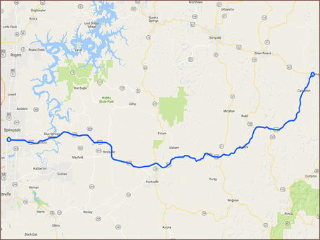 This 59 mile ride follows along the Ozark Plateau and offers plenty of long sweeping curves.