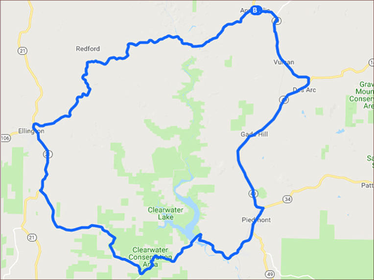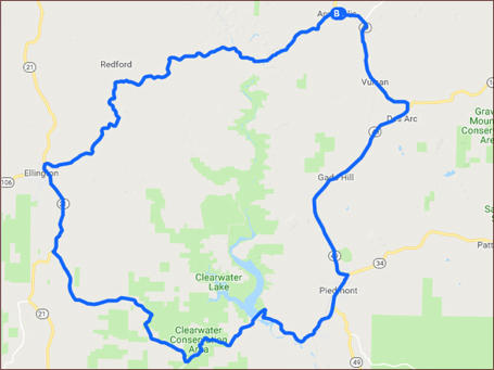 This 70 mile ride loops around scenic Clearwater Lake and the