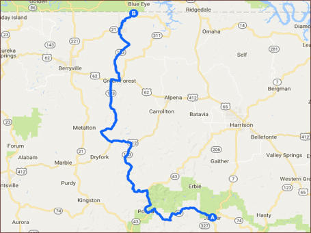 This 63 mile ride covers the very scenic AR 74 and AR 103 to