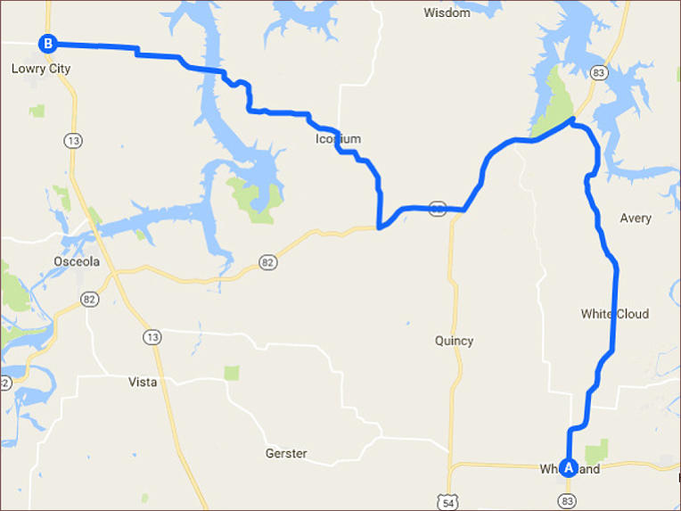 Step by Step Directions:From WheatlandHead north on State Hwy B toward Main St N 7.84 mi * Turn leftonto State Hwy K 5.42 mi * Turn left onto MO-83 S 5.20 mi *Turn right onto MO-82 W 3.08 mi * Turn right onto State HwyU 3.89 mi * Continue onto NE State Hwy C 1,004 ft * Turn left tostay on NE State Hwy C 11.6 mi