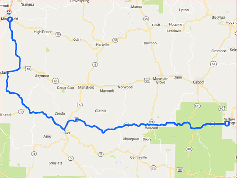 MO-5 N/MO-76 E 2.34 mi * Turn right onto MO-76 E 43.6 mi