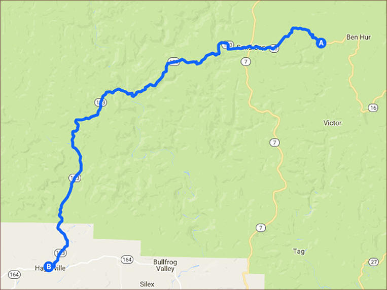 Step by Step Directions:From Pedestal RockHead east on AR-16 W 5.89 mi * Continue straight onto AR-123S 27.2 mi
