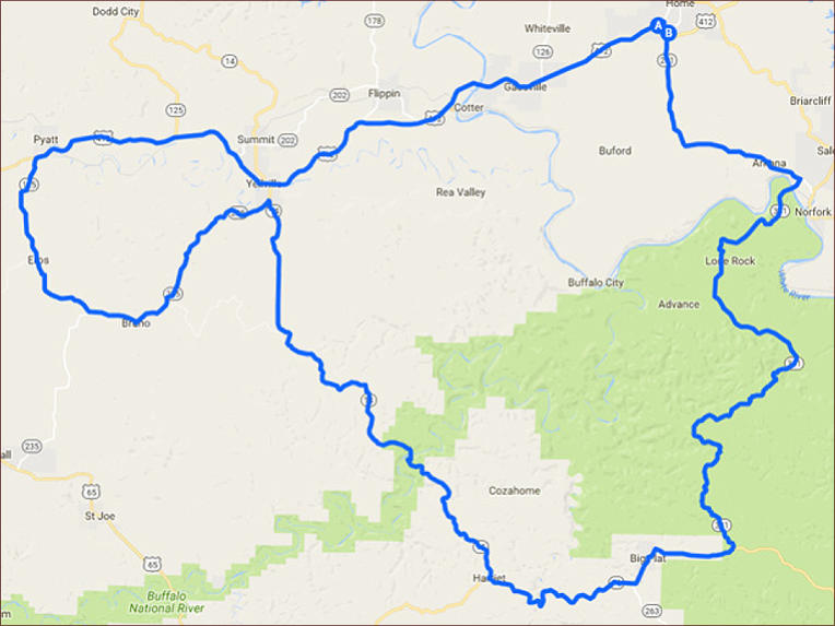 Step by Step Directions:From Mountain HomeHead east on US-62 SW E 509 ft * Continue onto US-62 BUS E 889 ft * Make a U-turn 837 ft * Turn leftonto US-62 SW E 0.467 mi * Turn right onto AR-201 S 9.99 mi * Turn right onto AR-341 S 25.2 mi *Turn right onto AR-14 W 3.77 mi * Turn left onto AR-14 W/2nd Continue to follow AR-14 W 1.21 mi *Turn right to stay on AR-14 W 8.01 mi * Turn right to stay on AR-14 W 22.9 mi * Sharp left onto AR-235S 10.7 mi * Continue straight onto AR-125 N 7.99 mi * Turn right onto AR-125 N/State Hwy 125N/US-412 E/US-62 E Continue to follow US-412 E/US-62 E 29.6 mi